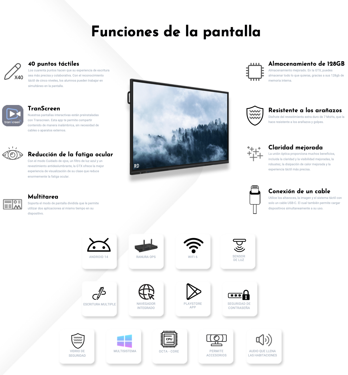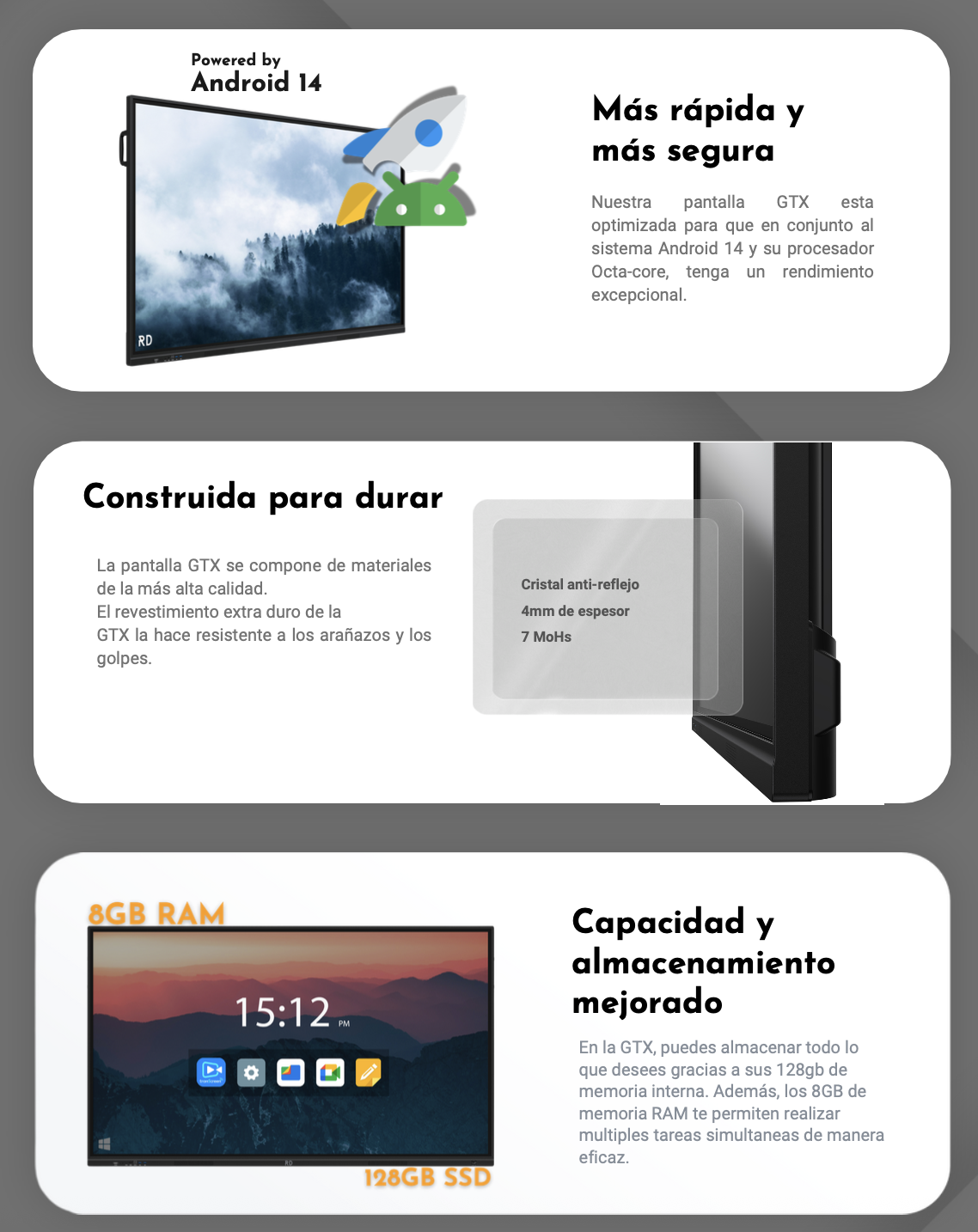 Nuestra pantalla interactiva más avanzada, con Android 14, calidad de imagen excepcional y respuesta táctil ultrarrápida. Su diseño elegante y funcionalidad versátil la hacen ideal para aulas, salas de reuniones y exhibiciones.